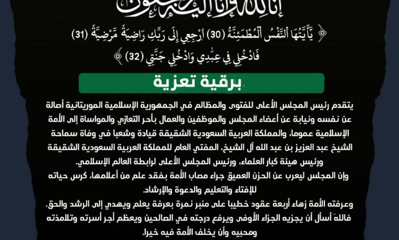 يتقدم رئيس المجلس الأعلى للفتوى والمظالم في الجمهورية الإسلامية الموريتانية أصالة عن نفسه ونيابة عن أعضاء المجلس والموظفين والعمال بأحر التعازي والمواساة إلى الأمة الإسلامية عموما، والمملكة العربية السعودية الشقيقة قيادة وشعبا في وفاة سماحة الشيخ عبد العزيز بن عبد الله آل الشيخ، المفتي العام للملكة العربية السعودية الشقيقة ورئيس هيئة كبار العلماء، ورئيس المجلس الأعلى لرابطة العالم الإسلامي.