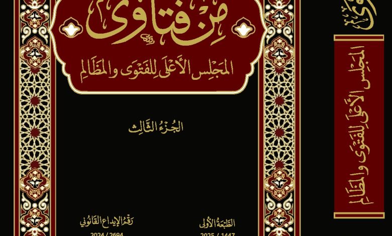 بحول الله وقوته، أصدر المجلس الأعلى للفتوى والمظالم الجزء الثالث من كتابه: “من فتاوى المجلس”، وذلك في إطار جهوده العلمية المستمرة في جمع الفتاوى الصادرة عنه وتوثيقها، وتيسير وصولها للباحثين وعموم المهتمين بالشأن الفقهي.